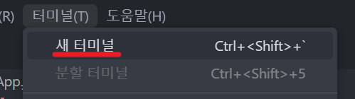 상단에 터미널(T)에 새 터미널을 누르면 아래 터미널 창이 나타난다