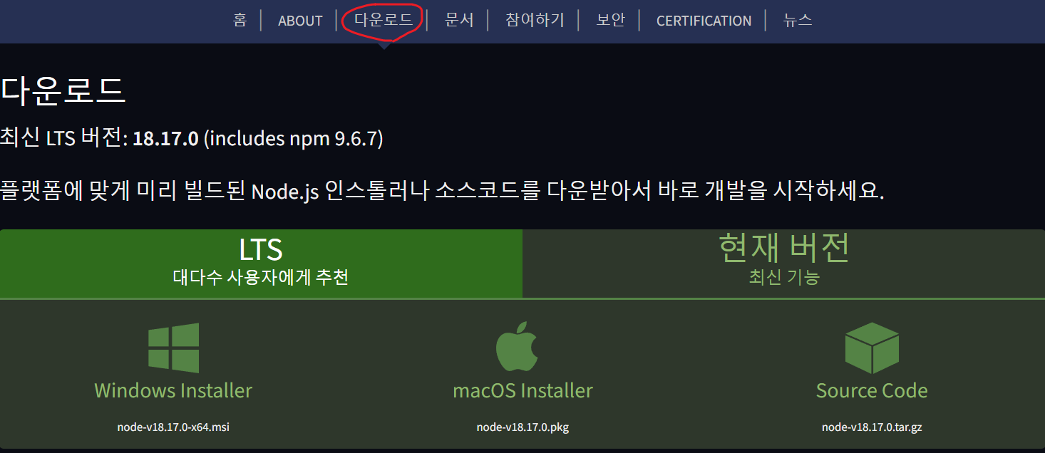홈페이지에 접속하여 Node.js LTS 버전을 설치한다.
